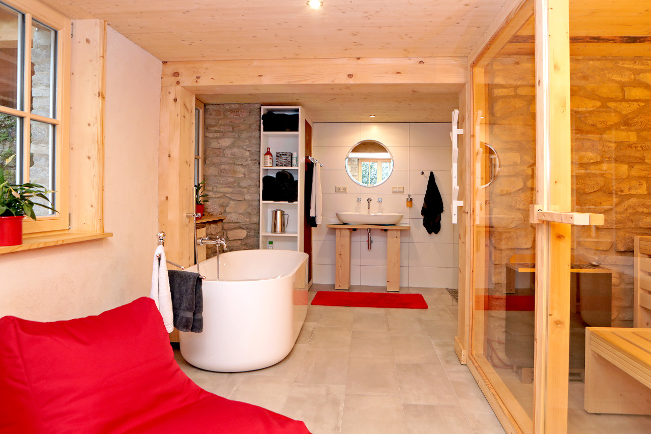 Das 150 qm große Steinhaus verfügt über 4 Schlafzimmer, zwei Bäder und einen Wellnessbereich mit Sauna. Holz- und Steinwände schaffen im Zusammenspiel mit der geschmackvollen Einrichtung ein naturverbundenes Wohlfühlambiente, das sich über drei Etagen erstreckt.