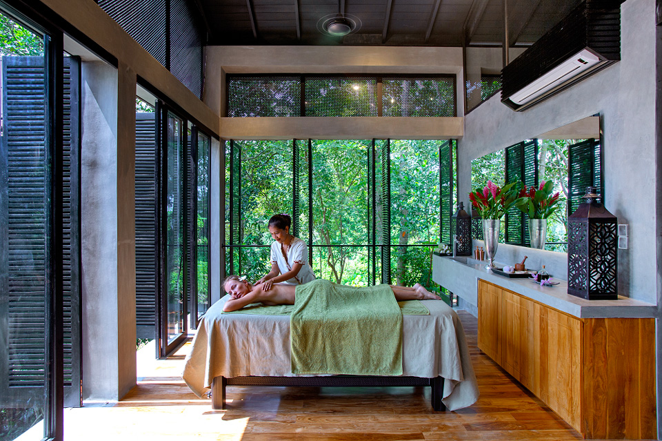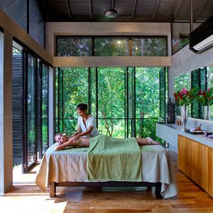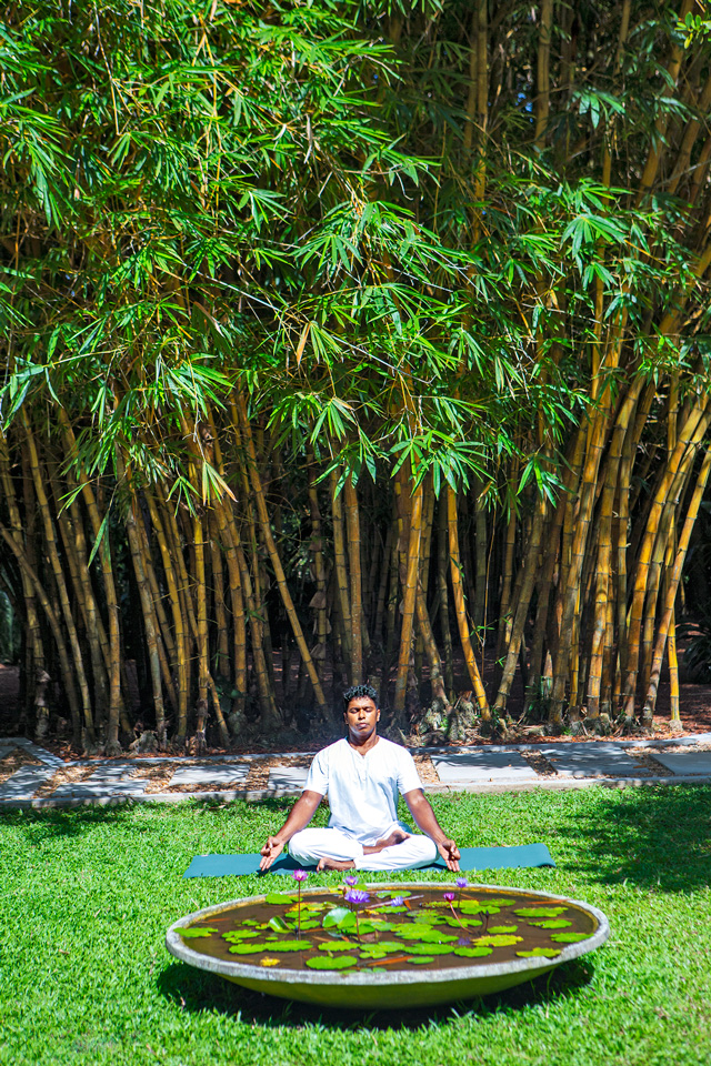 Das Spa liegt versteckt im dicht gewachsenen Grün der Natur. Abschalten und Zur-Ruhe-Kommen geschieht hier wie von selbst. Schon der angelegte Weg zum Dschungel-Spa ist eine Vorbereitung auf die Behandlung. Er führt vorbei an in großen Schalen schwimmendem Lotus, dichten Bambusstämmen immer begleitet von dem natürlichen „Haritha-Sound“, ein Konzert exotischer Vogelstimmen.